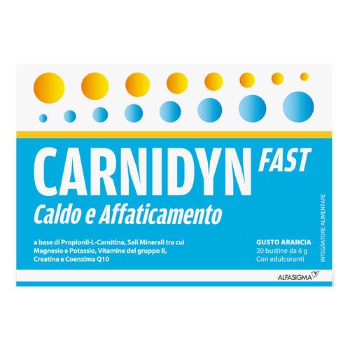 Integratore alimentare a base di propionil-L-carnitina, sali minerali tra cui magnesio e potassio, vitamine del gruppo B, creatina e coenzima Q10. Con edulcoranti. Utile come supporto all'organismo nei casi di stanchezza fisica, in quanto indicato per il recupero del tono muscolare e il reintegro idrosalino. Carnidyn Fast Magnesio e Potassio con propionil-L-carnitina ha una formulazione equilibrata di sali minerali, vitamine, creatina e coenzima Q10, nutrienti chiave per il metabolismo energetico muscolare e per un corretto bilancio idrosalino.